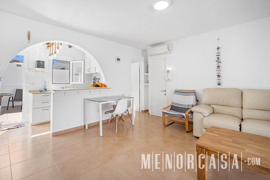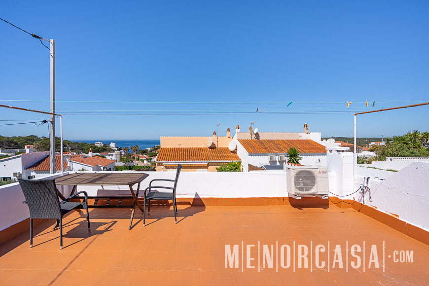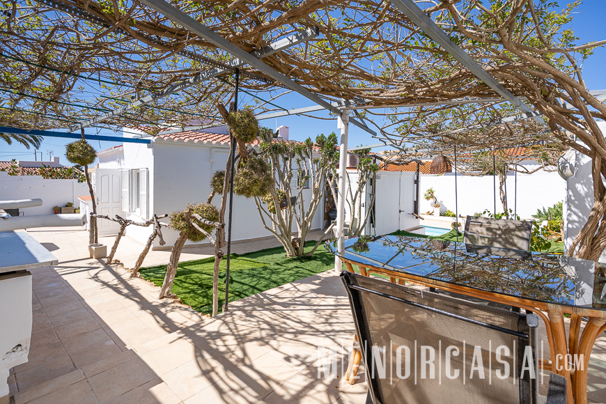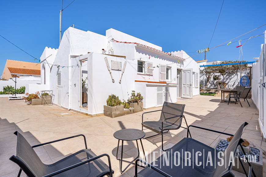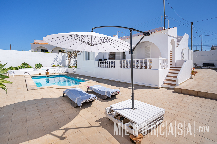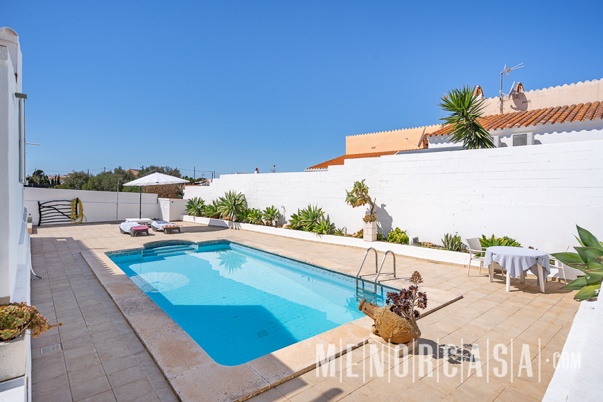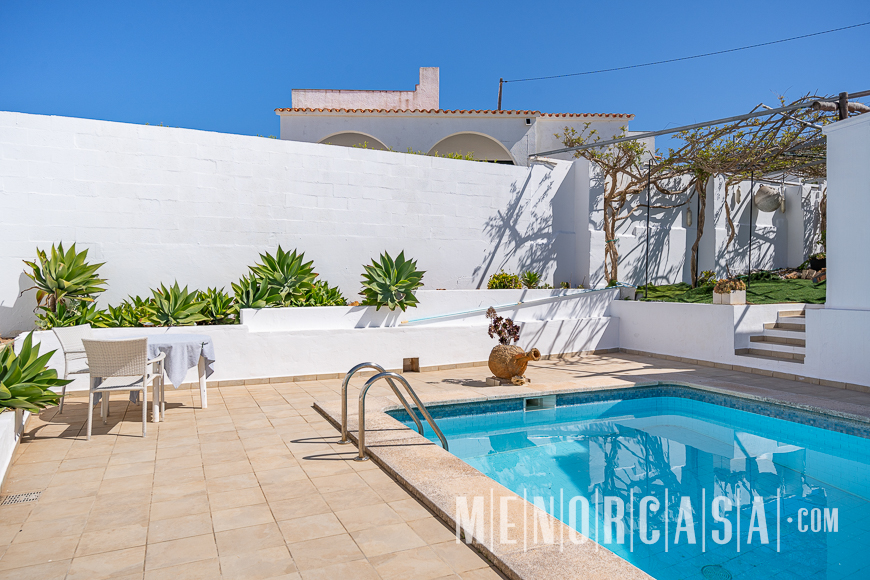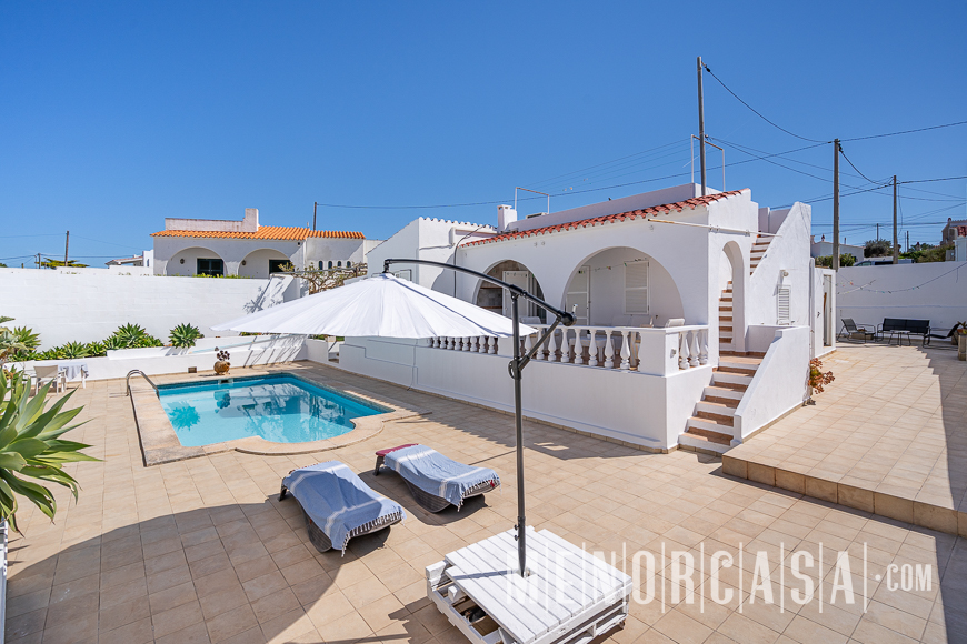 With beautiful sea views reaching as far as Mallorca, this immaculate and pretty detached villa in Calan Porter is located in a very quiet area offering a built area of 90mts2 and standing on a plot of 450mts2. Built on one level this lovely property is ideal for all year living or as a lock up and go having a very low maintenance garden consisting mainly of terraces that surround the villa and provide plenty of areas for either enjoying the sun or sitting in the shade and relaxing. There is also an exterior kitchen and eating area which are very much a part of the Mediterranean lifestyle. The accommodation offered comprises of 2 double bedrooms, both with fitted wardrobes and air conditioning, a shower room and a bathroom. The living area is open plan with the kitchen and leads out to a spacious covered terrace overlooking the swimming pool and having sea views. The living area also has air conditioning. There is a third single bedroom but this is currently used as a store room. The garden surrounds the entire property and has been very nicely done having an exterior kitchen with BBQ and bathroom. There are plenty of areas to escape the sun and relax in the shade and plenty of terrace area around the pool for sunbathing. Exterior stairs lead up to a fantastic roof terrace with superb sea views. This property is sold semi furnished and equipped. Calan Porter is a very popular coastal town on the South Coast of Menorca with a lovely sandy beach and a variety of bars, shops and restaurants. The nearest main town is that of San Clemente with Mahon, the capital of Menorca being just a 10 minute drive away.