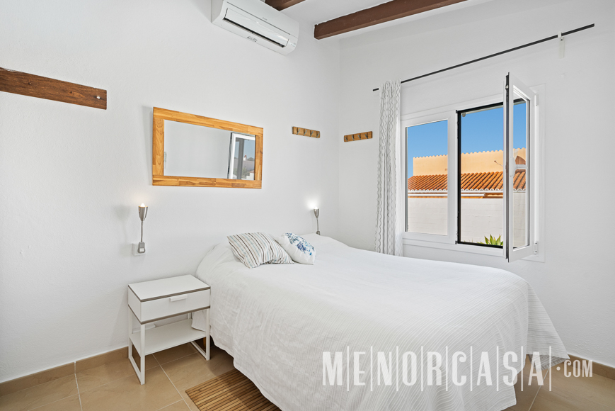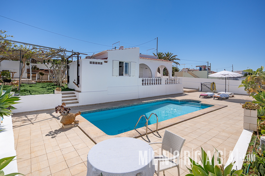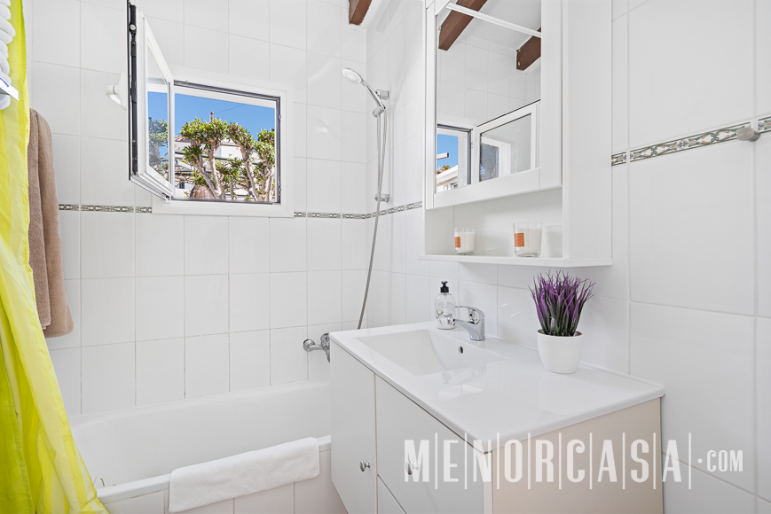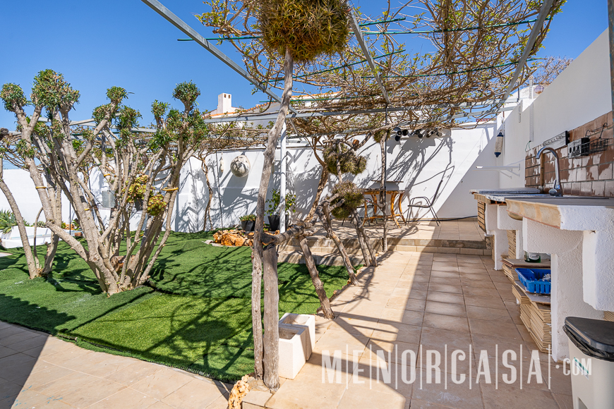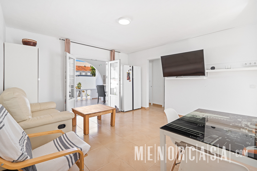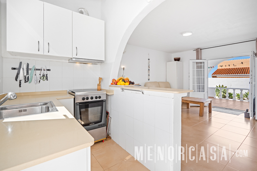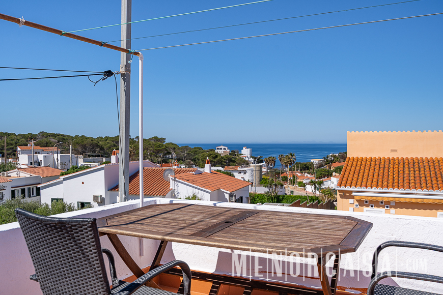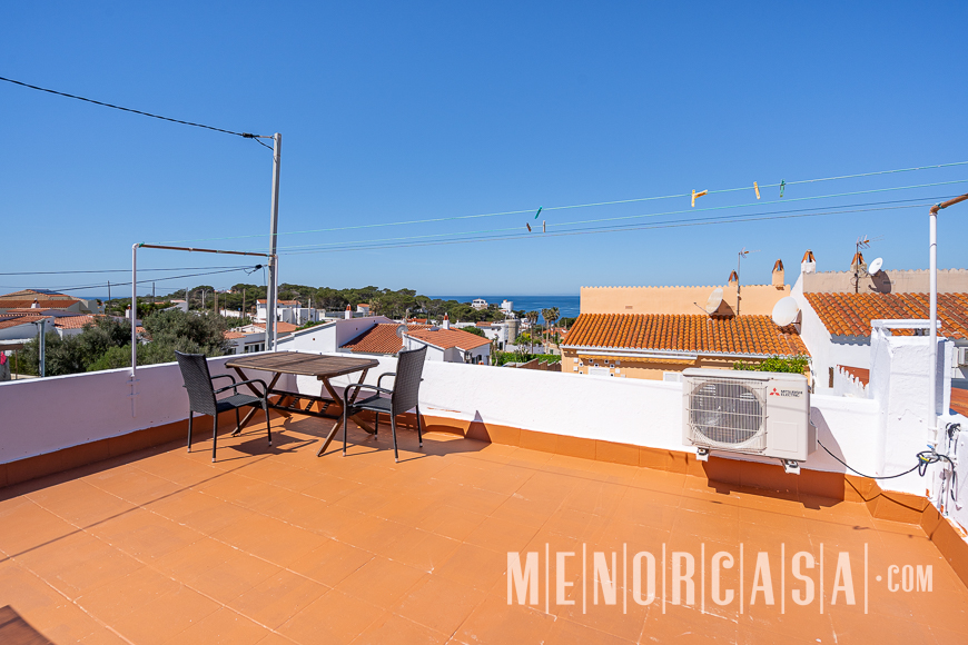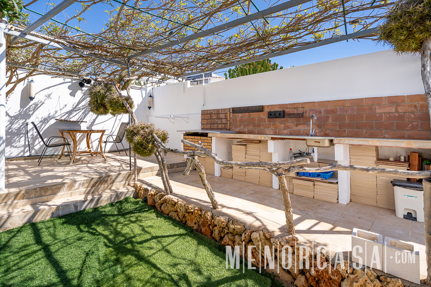 With beautiful sea views reaching as far as Mallorca, this immaculate and pretty detached villa in Calan Porter is located in a very quiet area offering a built area of 90mts2 and standing on a plot of 450mts2. Built on one level this lovely property is ideal for all year living or as a lock up and go having a very low maintenance garden consisting mainly of terraces that surround the villa and provide plenty of areas for either enjoying the sun or sitting in the shade and relaxing. There is also an exterior kitchen and eating area which are very much a part of the Mediterranean lifestyle. The accommodation offered comprises of 2 double bedrooms, both with fitted wardrobes and air conditioning, a shower room and a bathroom. The living area is open plan with the kitchen and leads out to a spacious covered terrace overlooking the swimming pool and having sea views. The living area also has air conditioning. There is a third single bedroom but this is currently used as a store room. The garden surrounds the entire property and has been very nicely done having an exterior kitchen with BBQ and bathroom. There are plenty of areas to escape the sun and relax in the shade and plenty of terrace area around the pool for sunbathing. Exterior stairs lead up to a fantastic roof terrace with superb sea views. This property is sold semi furnished and equipped. Calan Porter is a very popular coastal town on the South Coast of Menorca with a lovely sandy beach and a variety of bars, shops and restaurants. The nearest main town is that of San Clemente with Mahon, the capital of Menorca being just a 10 minute drive away.