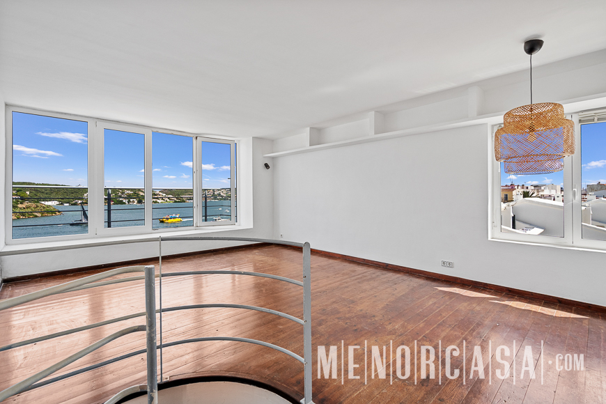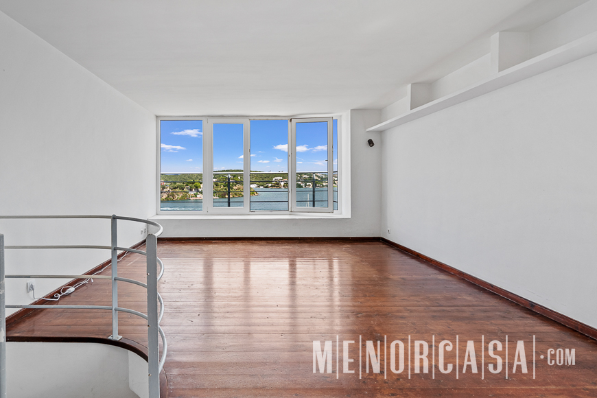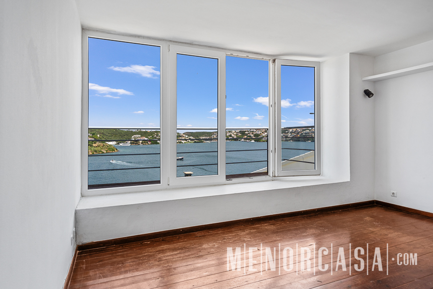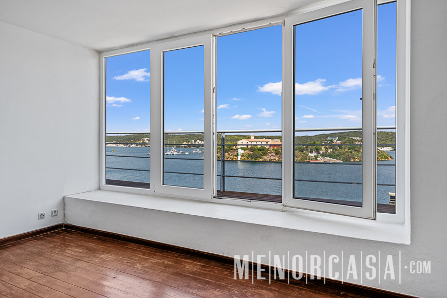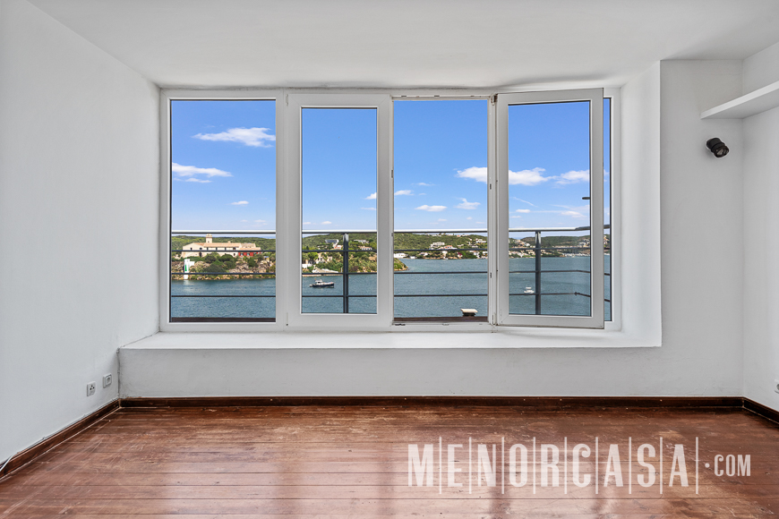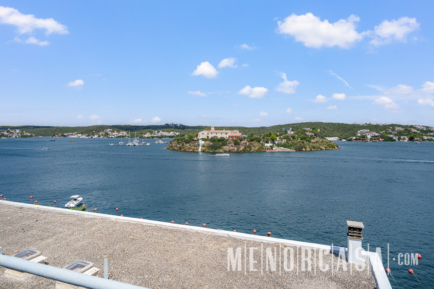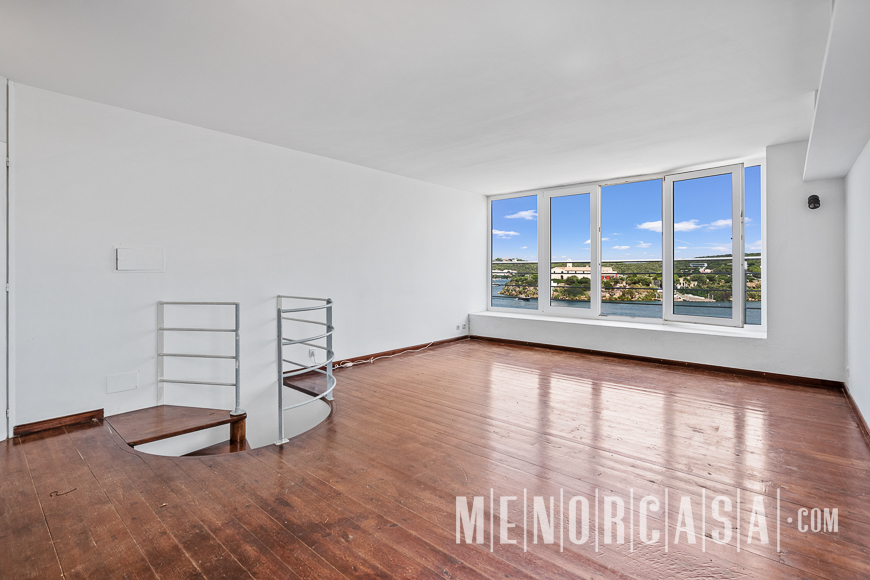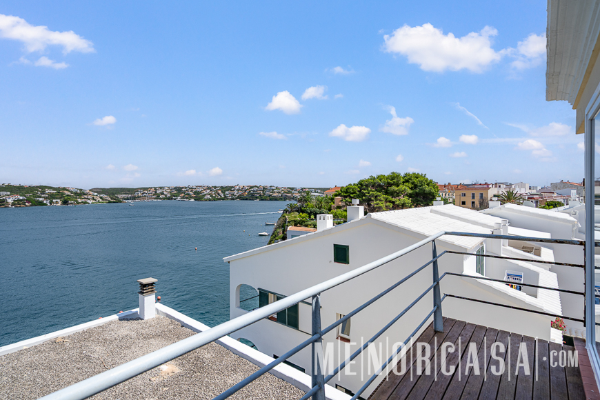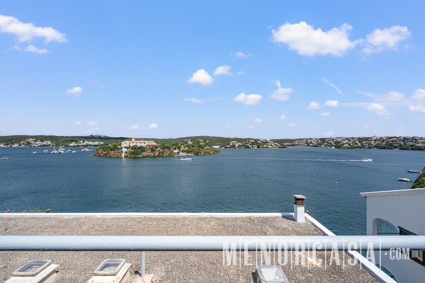 With incredible front line sea views, this duplex style property forms part of a small complex on the outskirts of Es Castell and has the use of a shared swimming pool and gardens. With a built area of approximately mts2, the property is entered via an exterior spiral stairway that leads directly in the open plan lounge and dining room. This leads out to a large terrace that runs the entire width of this property and literally has views along the whole length of Mahon Port. On this level there is also an independent kitchen, a utility room and a cloakroom. A spiral stairway leads down from the lounge to the three bedrooms and a bathroom. The floors throughout are parquet. Es Castell is a popular town located just a few minutes drive away from the other main town of San Luis and Mahon, the capital of Menorca. Offering all main services, most of which are within walking distance of this duplex, Es Castell is popular for both all year living or as a holiday ‘lock up and go’.