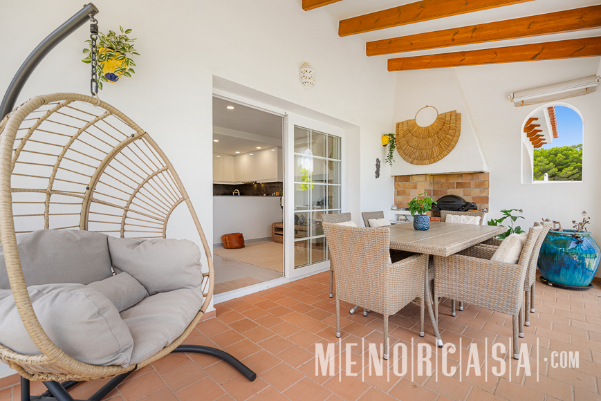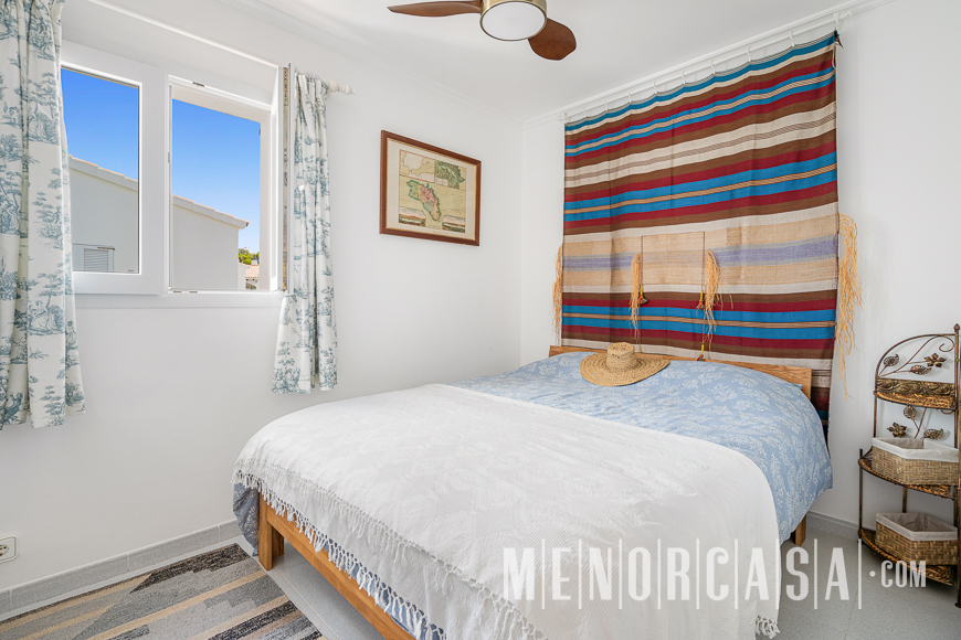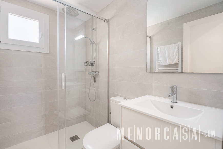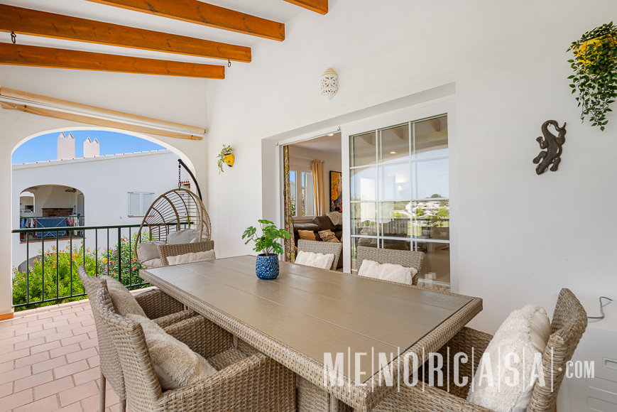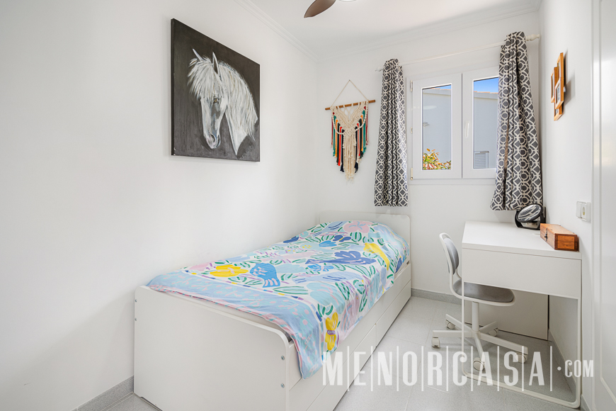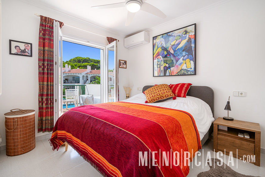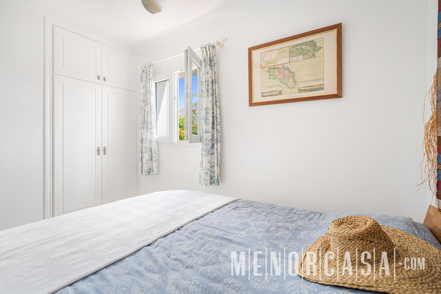 Located directly opposite the 18 hole golf course, this immaculate, 1st floor apartment forms part of a beautiful complex originally designed and built by Taylor Woodrow and has the use of 3 shared swimming pools and gardens. With a built area of approximately 66mts2, this spacious corner property offers an open plan lounge, dining room and kitchen with breakfast bar and leading out to a large covered terrace with a brick built BBQ. There are 3 bedrooms ( 2 twin and 1 double) and 2 bathrooms, one of which is en suite in the main bedroom. All bedrooms have fitted wardrobes and the main bedroom does also lead out to a small private terrace overlooking the main swimming pool. All exterior carpentry is UVPC double glazed and there is air con/ heating in the main living area. Son Parc is a very popular residential area located about 20kms from Mahon, the capital of Menorca. Local amenities include a few seasonal bars and restaurants and of course the beautiful beach known as Son Saura, boasting crystal clear waters and a white sandy beach. The nearest main town is that of Es Mercadal and other nearby areas include Arenal D’en Castell, Fornells and Na Macaret.
